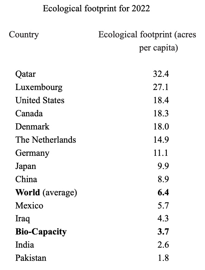 To give you a better idea of the overconsumption of the earth’s natural resources, here is a table showing the number of acres per capita that were required in 2022 by several countries.